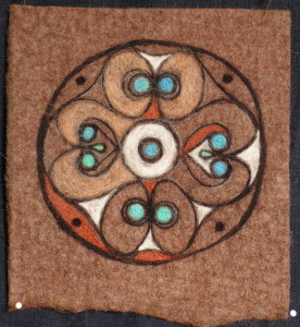 The central circle from the Battersea Shield. On alpaca wool felt from Ontario, wool and alpaca roving from P.E.I. and Ontario.